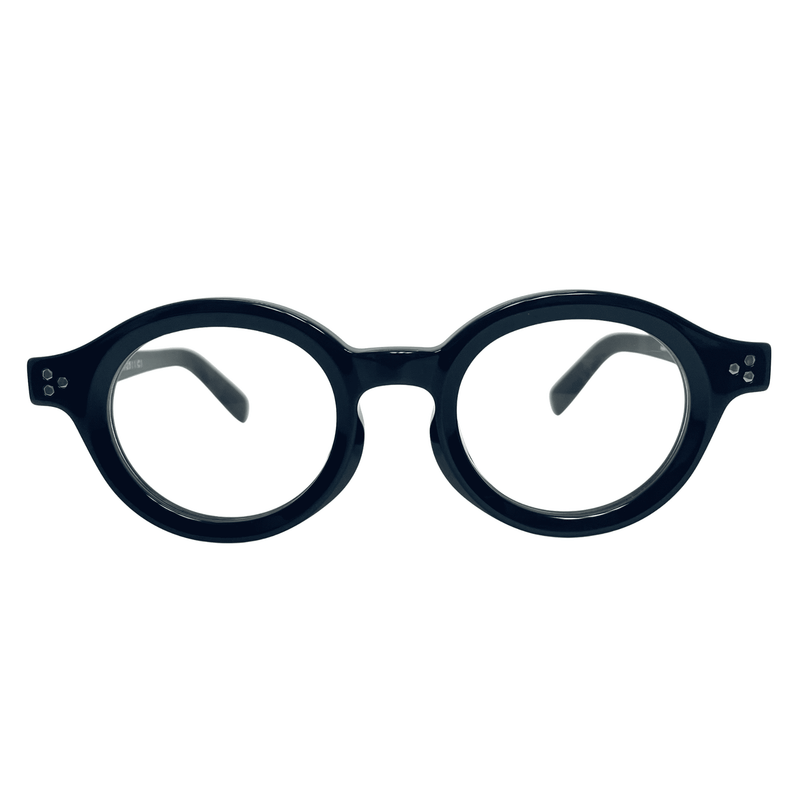 最大の特徴は、見る者を惹きつける極太のアセテートリム。贅沢に生地を使用することで生まれる立体感と重厚な光沢は、顔周りに力強いアクセントを与えます。 その存在感のあるフロントとテンプルサイドには、フレンチヴィンテージを彷彿とさせる「3点鋲(スリードット)」のカシメ飾りを配置。ミニマルな円形のデザインの中で、金属の無骨な輝きが洗練されたスパイスとなっています。