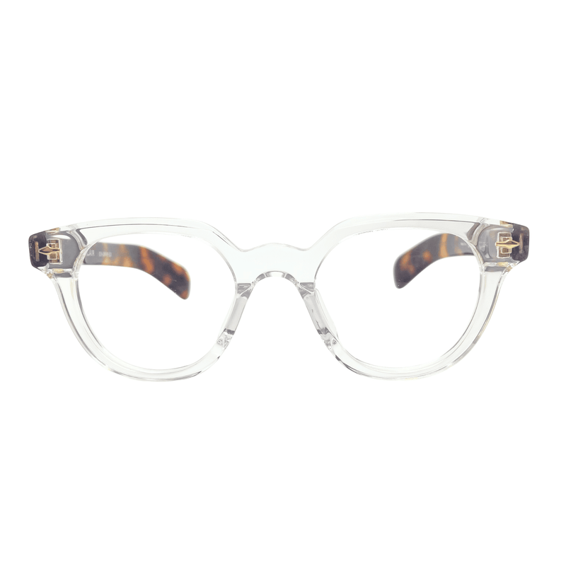 テンプルサイドには縦に並んだ「2点鋲(ツードット)」を配置し、間延びしがちな太いテンプルにピリッとしたアクセントをプラス。 クリア系のカラーではフロントとテンプルの色が異なる「バイカラー」の楽しさを、単色モデルでは重厚な物質感を存分に味わえる、表情豊かなモデルです。 しっかりとした堅牢なヒンジが、デザインだけでなく道具としての安心感も支えています。